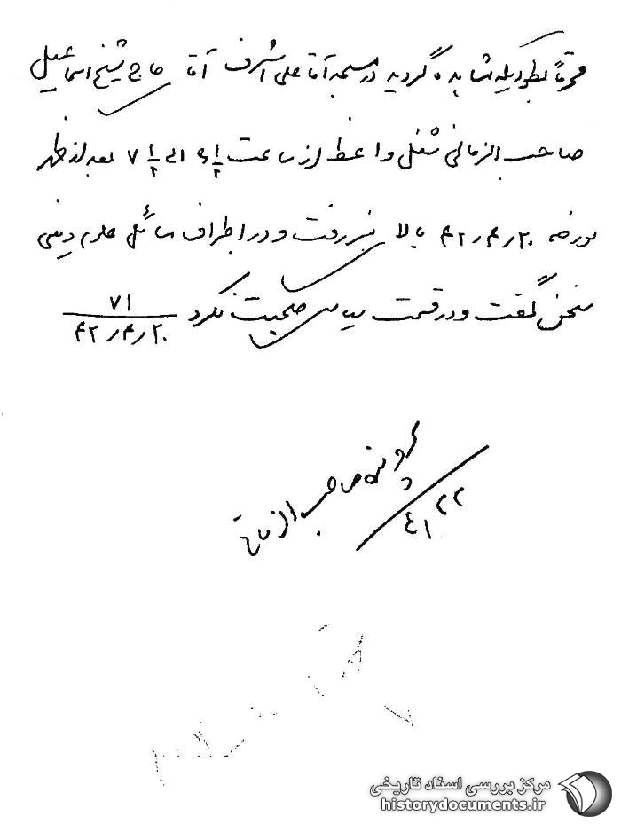 محترماً به طوری که مشاهده گردید در مسجد آقا علی اشرف آقای حاج شیخ اسماعیل صاحبالزمانی1 شغل واعظ از ساعت 2/61 الی2/71 بعدازظهر مورخه 20 /4 /42 بالای منبر رفت و در اطراف مسائل علوم دینی سخن گفت و در قسمت سیاسی صحبت نکرد. 71 ـ 20 /4 /42