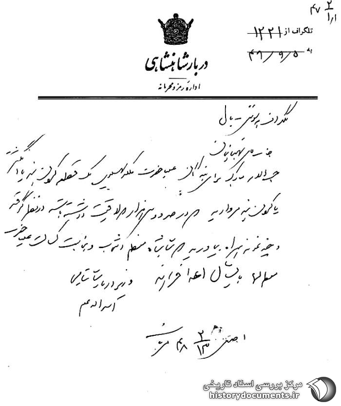 حسبالامر مبارک برای بندگان علیاحضرت ملکه پهلوی یک قطعه گردنبند یا انگشتر یا گردنبند مروارید که در حدود سی هزار دلار قیمت داشته باشد در نظر گرفته و چند نمونه همراه بیاورید که شاهنشاه معظم انتخاب و به مناسبت کسالت علیاحضرت معظملها به ایشان اهدا فرمایند.