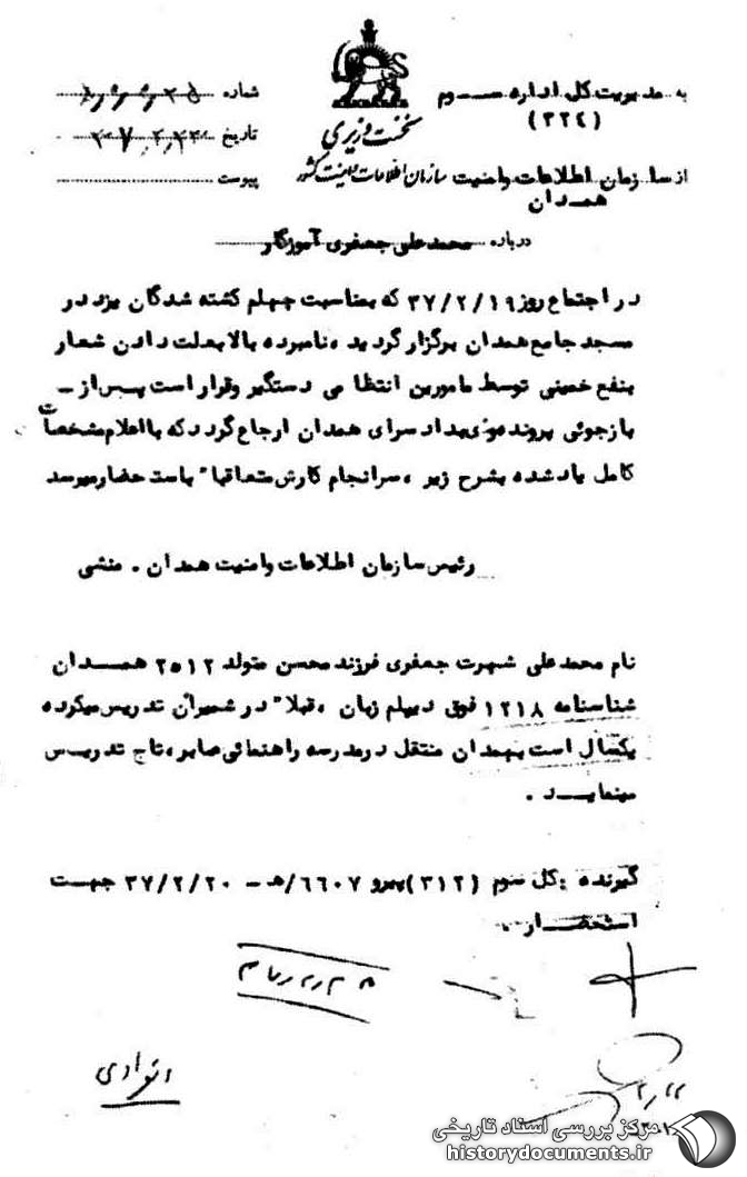 در اجتماع روز 19 /2 /37 که به مناسبت چهلم کشته شدگان یزد در مسجد جامع همدان برگزار گردید، نامبرده به علت دادن شعار به نفع خمینی توسط مأمورین انتظامی دستگیر و قرار است پس از بازجویی پرونده وی دادسرای همدان ارجاع گردد که با اعلام مشخصات کامل یاد شده به شرح زیر، سرانجام کارش متعاقباً به استحضار میرسد.