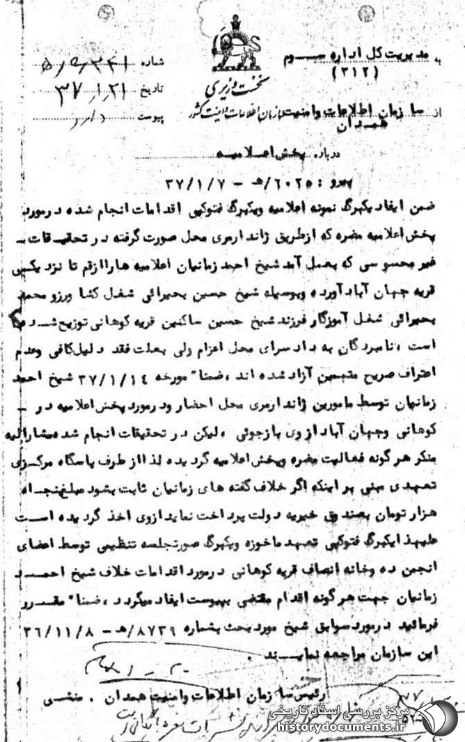 ضمن ایفاد یک برگ نمونه اعلامیه و یک برگ فتوکپی اقدامات انجام شده در مورد پخش اعلامیه مضره که از طریق ژاندارمری محل صورت گرفته در تحقیقات غیر محسوس که به عمل آمد شیخ احمد زمانیان اعلامیهها را از قم تا نزدیکی قریه جهانآباد آورده و به وسیله شیخ حسین بحیرائی شغل کشاورز و محمد بحیرائی شغل آموزگار فرزند شیخ حسین ساکنین قریه کوهانی توزیع شده است، نامبردگان به دادسرای محل اعزام به علت فقد دلیل کافی و عدم اعتراف صریح متهمین آزاد شدهاند، ضمناً مورخه 14 /1 /37 شیخ احمد زمانیان توسط مأمورین ژاندارمری محل احضار و در مورد پخش اعلامیه در کوهانی و جهانآباد از وی بازجویی، لیکن در تحقیقات به انجام شده مشارالیه منکر هرگونه فعالیت مضره و پخش اعلامیه گردیده لذا از طرف پاسگاه مرکزی تعهدی مبنی بر اینکه اگر خلاف گفتههای زمانیان ثابت بشود مبلغ پنجاه هزار تومان به صندوق خیریه دولت پرداخت نماید از وی اخذ گردیده است علیهذا یک برگ فتوکپی تعهد ماخوزه و یک برگ صورتجلسه تنظیمی توسط اعضای انجمن ده و خانه انصاف قریه کوهانی در مورد اقدامات خلاف شیخ احمد زمانیان جهت هرگونه اقدام مقضی به پیوست ایفاد میگردد، ضمناً مقرر فرمائید در مورد سوابق شیخ مورد بحث به شماره 8739/ ه /8 /11 /36 این سازمان مراجعه نمایند.