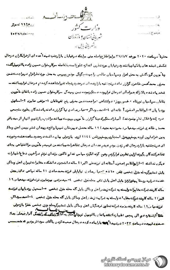محترماً در ساعت 2020 مورخه 7 /1 /37 برابر اطلاع واصله مبنی بر اینکه در خیابان بازار جنب شهدا عدّهای از خرابکاران در حال شکستن شیشههای بانکها میباشند و در خیابان مورد نظر بیاندازه شلوغ است بلافاصله سرکار ستوان حسینزاده با اتومبیل گشت و مأمورین گروه گشتی به محل اعزام و سرپاسبان صالحی را جهت چگونگی موضوع و بررسی به محل مورد نظر اعزام در مراجعت ضمن معرفی محمدمحسن طاهری گزارش داد در پنجشنبه بازار عدّهای در حدود پنجاه نفر را مشاهده کردم در حال فرار میباشند شخص یادشده بالا را که همراه آنها در حال فرار بود دستگیر نموده ضمن رسیدگی سرکار ستوان حسینزاده به اتفاق مأمورین به نامان سرپاسبان نورپناه، خسروپرویز، دولتشاهی مراجعت ضمن معرفی پنج نفر به نامان 1- مرتضی صابری 2- اسماعیل رودباریان 3- ابوالقاسم اصغری آستانهای 4- احمد سوداگر1 5- عباس صادق نیا2 گزارش دادند یادشدگان به طور دستهجمعی در حرکت و اخلال نظم مینمودند که آنها را دستگیر که عیناً گزارش مأمورین به پیوست میباشد مراتب پس از تفهیم اتهام از سیدباقر محسن طاهری، فرزند سیدعباس (معروف به مجید) 19 ساله محصّل دبیرستان شهریار واقع در میدان ششم بهمن، اهل و ساکن بابل، افرا داربن کوچهی یوسفپور، منزل استیجاری یوسفپور، تلفن 2144 از وی بازجویی بیان داشت در حدود ساعت هشت و خوردهای در پنجشنبه بازار در حال قدم زدن بودم دیدم عدّهای در حال تظاهرات میباشند من ترسیدم مأمورین مرا اشتباهی به جای تظاهرکنندگان بگیرند از این نظر من فرار کردم و هیچگونه انگیزهی سیاسی ندارم تاکنون به زندان نرفتم در آخرین دفاع اظهارات دیگری نداشت 2- از ابوالقاسم اصغری آستانهای فرزند علیاکبر21 ساله دانشجوی دانشکدهی مخابرات تهران اهل و ساکن بابل شمشیرگرمحله، منزل شخصی، تلفن 5865 3- عباس صادقنیا بابلی فرزند محمدصادق، 21 ساله، سپاهی دانش، محل خدمت در قریه روستا پهناور از قرا بابل اهل بابل [ناخوانا] محله، منزل شخصی 4- سیدمرتضی میرصابری ترک، فرزند سید عباس، 19 ساله، کارمند شرکت مخابرات وابسته به شرکت زیمنس، اهل و ساکن بابل، گله محله، منزل شخصی 6- احمد سوداگر، فرزند عباس، 19 ساله، کارمند روزمزد شرکت تعاون فرهنگیان، اهل و ساکن شمشیرگرمحله منزل شخصی، منفرداً بازجویی متفقاً از شماره دوم الی پنجمی اظهار داشتند به اتفاق با اتومبیل تویوتا متعلق به آقای رضایی که رانندگی آن را رجبعلی رضایی عهدهدار بوده در ساعت 20:22 در شهدا ما را پیاده کرده در حال صحبت کردن با آقای سوداگر بودیم که مأمورین ما را سوار اتومبیل خود کردند به کلانتری آوردند ولی ما اطّلاعی از اخلال نظم و یا شرکت در آن نداشتهایم و هیچگونه سابقهای در این مورد نداریم و تاکنون به زندان نرفتهایم در آخرین دفاع اظهارات دیگری نداشتهاند ششمین [نفر] ضمن اظهارات چهار نفر اضافه کرده تازه از شرکت مرخّص شدم در حال عبور در خیابان شهدا بودم دوستان من که در بالا ذکر شده رسیدند در حال صحبت کردن بودیم مأمورین رسیدند ما را با اتومبیل خودشان به کلانتری آوردند و هیچگونه خلافی مرتکب نشدم و تاکنون به زندان نرفتم و در آخرین دفاع اظهارات دیگری نداشته توضیح اینکه از سپاهی دانش در حضور نمایندهی ژاندارمری از وی بازجویی به عمل آمد علیهذا پرونده امر که حاوی 8 برگ است جهت هرگونه اقدام شایسته به نظر میرسد.3 متصدی نگهبان کلانتری مرکز سرپاسبان قدیر