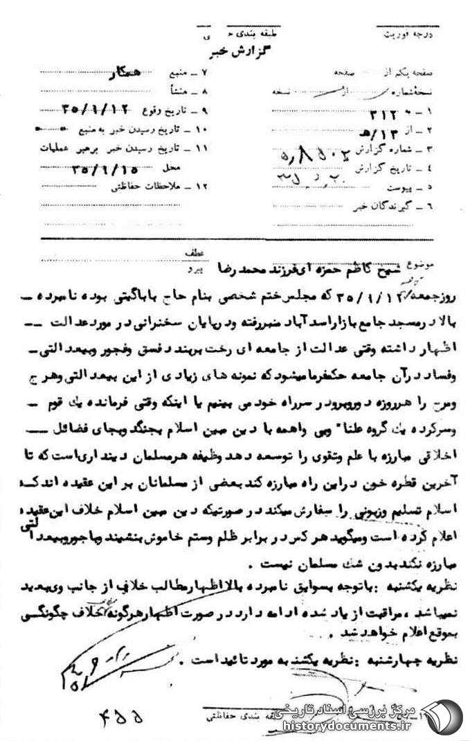 نظریه یکشنبه: با توجه به سوابق نامبرده بالا اظهارات مطالب خلاف از جانب وی بعید نمیباشد. مراقبت از یاد شده ادامه دارد در صورت اظهار هر گونه خلاف چگونگی به موقع اعلام خواهد شد.