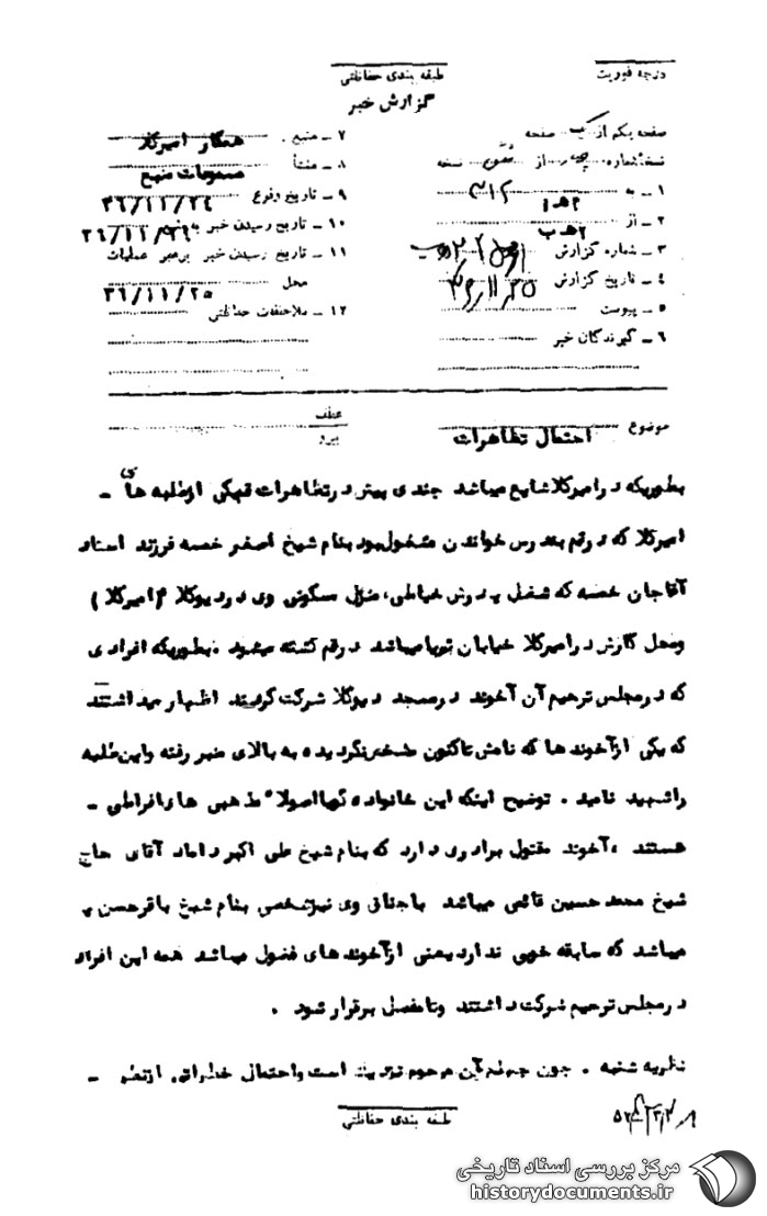 نظریه شنبه: چون چهلّم آن مرحوم نزدیک است و احتمال خطراتی از نظر سوء میرود و شاید هم روز یا شب جمعه باشد بسیار بجاست که از قبل ترتیبی داده شود که از برگزاری مجلس یا به هر صورت دیگر که مقتضی است اقدام گردد ضمناً اشخاصی به اسامی 1- شیخ محمد حسین قائمی2 2- شیخ باقرحسنپور 3- شیخ [علی] اکبر خمسه3 [ای] و شیخ عبدالواحد نقوی4 در خانوادهشان دارند و 3 نفر اول محرک برگزاری همه گونه مجالس هستند.