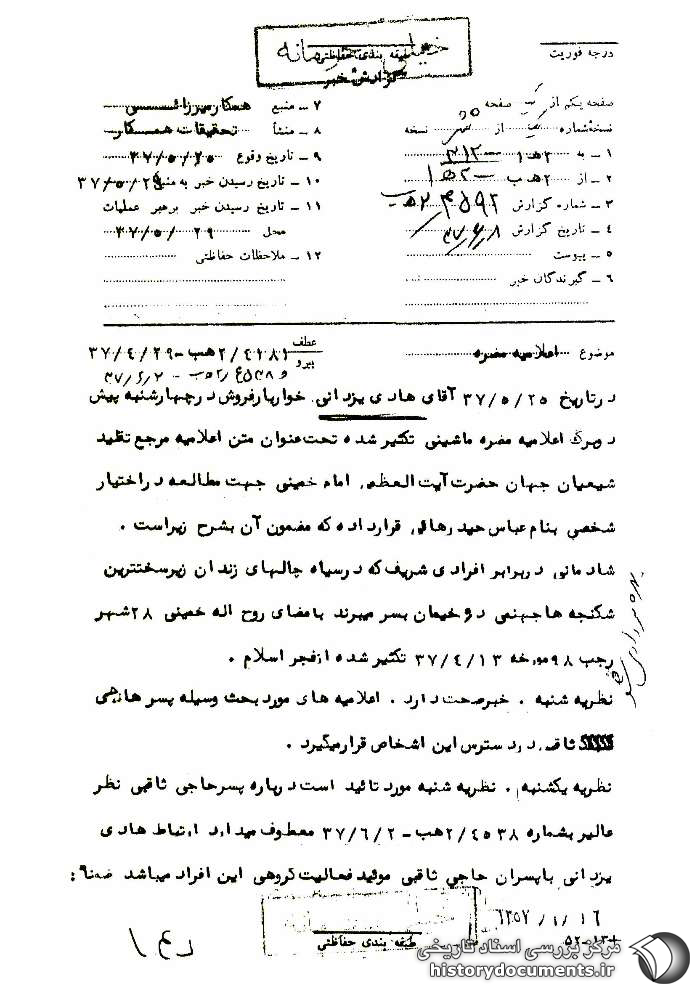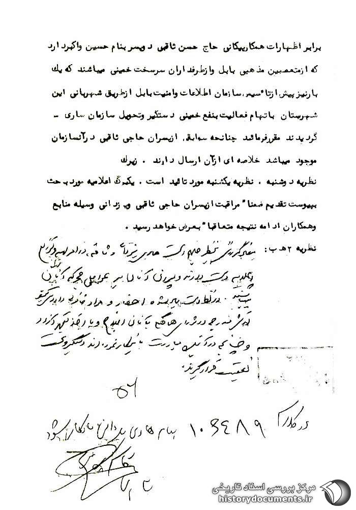 نظریه یکشنبه: نظریه شنبه مورد تائید است درباره پسر حاجی ثاقبی نظر عالی را به شماره 4538/ 2 ﻫ ب ـ 2 /6 /37 معطوف میدارد ارتباط هادی یزدانی با پسران حاجی ثاقبی مؤید فعالیت گروهی این افراد میباشد ضمناً برابر اظهارات همکار پیکانی حاج حسن ثاقبی دو پسر به نام حسین و اکبر دارد که از متعصّبین مذهبی بابل و از طرفداران سرسخت خمینی میباشند که یک بار نیز پیش از تأسیس سازمان اطلاعات و امنیت بابل از طریق شهربانی این شهرستان به اتهام فعالیت به نفع خمینی دستگیر و تحویل سازمان ساری گردیدند مقرر فرمائید چنانچه سوابقی از پسران حاجی ثاقبی در آن سازمان موجود میباشد خلاصهای از آن ارسال دارند. زیرک