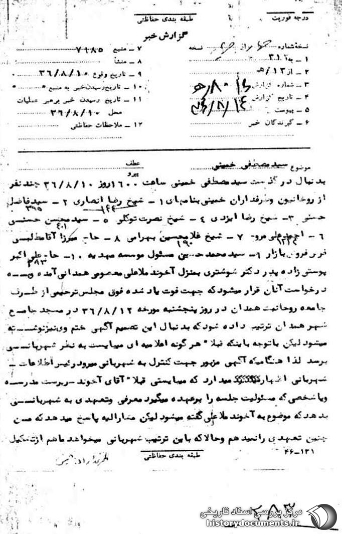به دنبال درگذشت سید مصطفی خمینی1 ساعت 16 روز 10 /8 /37 چند نفر از روحانیون و طرفداران خمینی به نامهای ۱- شیخ رضا انصاری ۲- سید فاضل حسنی ۳- شیخ رضا ایزدی 4 - شیخ نصرت توکلی 5- سید محسن حسنى 4- احمدعلى مروج ۷- شیخ غلامحسین بهرامی ۸- حاج میرزا آقا مطلبی فرش فروش بازار ۹- سید محمد حسین مسئول موسسه مهدیه ۱۰- حاج علیاکبر پوستیزاده پدر دکتر شوشتری به منزل آخوند ملاعلی معصومی همدانی آمده و به درخواست آنان قرار میشود که جهت فوت یاد شده فوق مجلس ترحیمی از طرف جامعه روحانیت همدان در روز پنجشنبه مورخه 12 /8 /36 در مسجد جامع شهر همدان ترتیب داده شود که به دنبال این تصمیم آگهی ختم وی نیز نوشته میشود لیکن با توجه به اینکه قبلاً هر گونه اعلامیهای میبایست به نظر شهربانی برسد لذا هنگامی که آگهی مزبور جهت کنترل به شهربانی میرود و رئیس اطلاعات شهربانی اظهار میدارد که میبایستی قبلاً آقای آخوند سرپرست مدرسه و یا شخصی که مسئولیت جلسه را بر عهده میگیرد معرفی و تعهدی به شهربانی بدهد که موضوع به آخوند ملاعلی گفته میشود لیکن مشارالیه پاسخ میدهد که من چنین تعهدی را نمیدهم و حالا که این ترتیب شهربانی میخواهد ما هم از تشکیل مجلس ترحیم خودداری مینمائیم و چنانچه کسی جهت مجلس ترحیم از ما تقاضا نماید اظهار میدارم که شهربانی از تشکیل مجلس جلوگیری نموده است