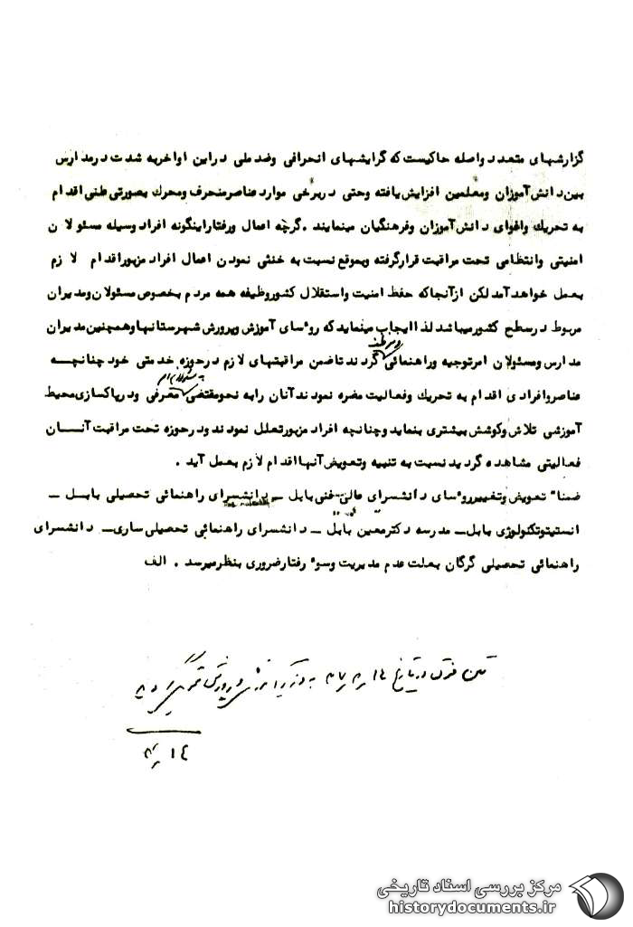 گزارشهای متعدد واصله حاکیست که گرایشهای انحرافی و ضدملّی در این اواخر به شدت در مدارس بین دانشآموزان و معلّمین افزایش یافته و حتی در برخی موارد عناصر منحرف و محرک به صورتی علنی اقدام به تحریک و اغوای دانشآموزان و فرهنگیان مینمایند. گرچه اعمال و رفتار اینگونه افراد وسیله مسئولان امنیتی و انتظامی تحت مراقبت قرار گرفته و به موقع نسبت به خنثی نمودن اعمال افراد مزبور اقدام لازم به عمل خواهد آمد. لکن از آنجا که حفظ امنیت و استقلال کشور وظیفه همه مردم به خصوص مسئولان و مدیران مربوط در سطح کشور میباشد. لذا ایجاب مینماید که رؤسای آموزش و پرورش شهرستانها و همچنین مدیران مدارس و مسئولان امر توجیه و راهنمائی و موظف گردند تا ضمن مراقبتهای لازم در حوزه خدمتی خود چنانچه عناصر و افرادی اقدام به تحریک و فعالیت مضرّه نمودند آنان را به نحو مقتضی به مسئولان امر معرفی و در پاکسازی محیط آموزشی تلاش و کوشش بیشتری بنماید و چنانچه افراد مزبور تعلل نمودند و در حوزه تحت مراقبت آنان فعالیتی مشاهده گردید نسبت به تنبیه و تعویض آنها اقدام لازم به عمل آید.