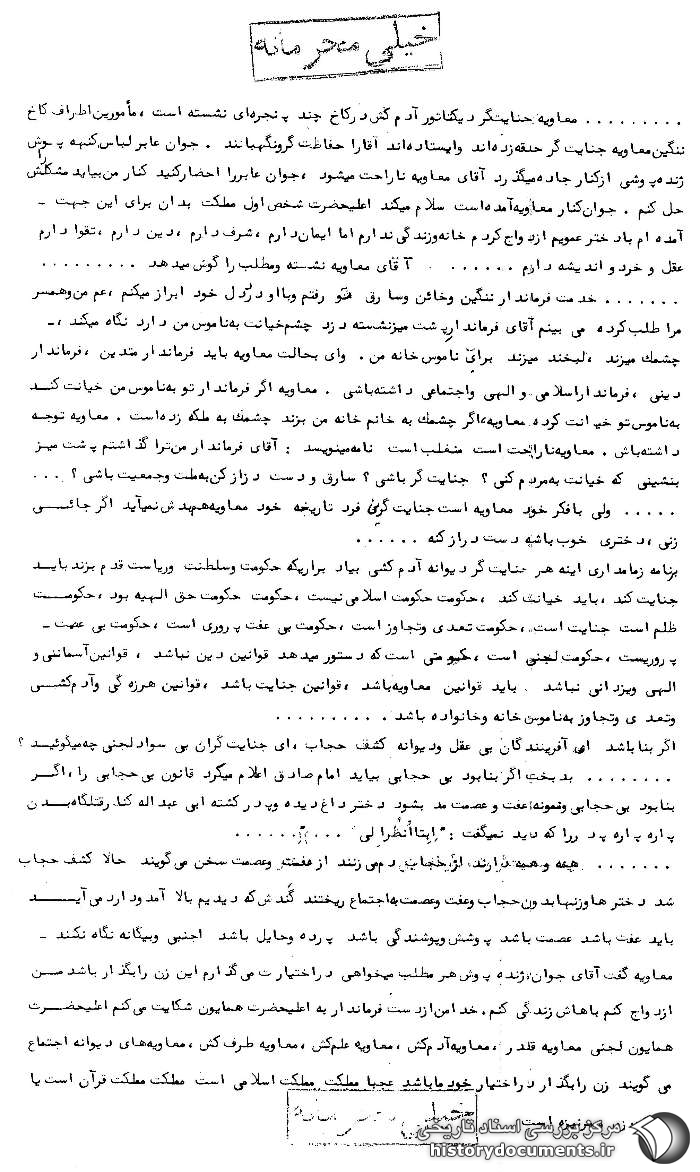 همه و همه دارند از حجاب دم میزنند از عفت و عصمت سخن میگویند حالا کشف حجاب شد دخترها و زنها بدون حجاب و عفت و عصمت به اجتماع ریختند گندش که دیدیم بالا آمد و دارد میآید باید عفت باشد عصمت باشد پوشش و پوشندگی باشد پرده و حایل باشد اجنبی و بیگانه نگاه نکنند معاویه گفت آقای جوان ژنده پوش هر مطلب میخواهی در اختیارت میگذارم این زن را بگذار باشد من ازدواج میکنم، خدا از دست من فرماندار به اعلیحضرت همایون شکایت میکنم اعلیحضرت همایون لجنی معاویه قلدر، معاویه آدم کش، معاویه طرف کش، معاویههای دیوانه اجتماع میگویند زن را بگذار در اختیار خود ما باشد عجبا مملکت، مملکت اسلامی است مملکت، مملکت قرآن است یا مملکت زور و سرنیزه است.