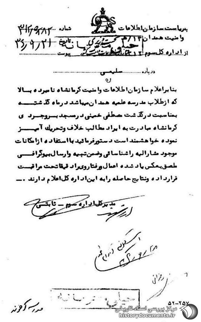 بنابر اعلام سازمان اطلاعات و امنیت کرمانشاه نامبرده بالا که از طلاب مدرسه علمیه همدان میباشد در ماه گذشته به مناسبت درگذشت مصطفی خمینی در مسجد بروجردی کرمانشاه مبادرت به ایراد مطالب خلاف و تحریکآمیز نموده خواهشمند است دستور فرمائید با استفاده از امکانات موجود مشارالیه را شناسنایی و ضمن تهیه و ارسال بیوگرافی ملصق به عکس یاد شده اعمال و رفتار وی را دقیقاً تحت مراقبت قرار داده و نتایج حاصله را به این اداره کل اعلام دارند.