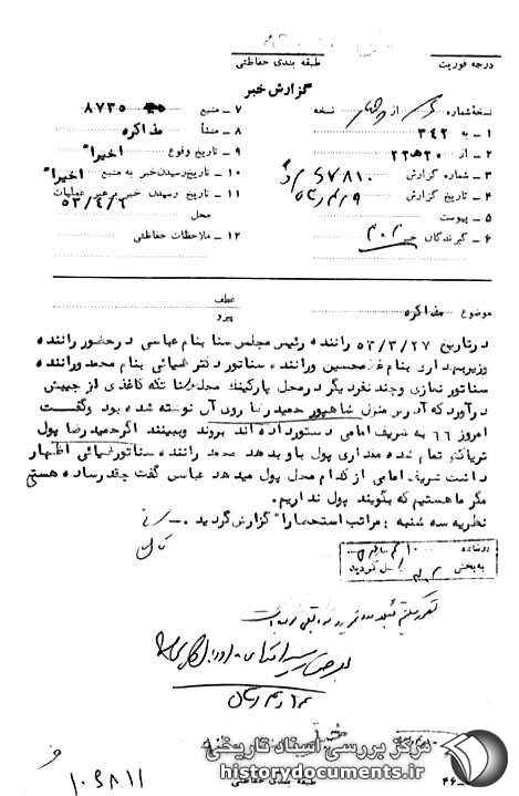 در تاریخ 27 /3 /53 راننده رئیس مجلس سنا به نام عباسی در حضور راننده وزیر بهداری به نام غلامحسین و راننده سناتور دکتر ضیایی به نام محمد و راننده سناتور نمازی و چند نفر دیگر در محل پارکینگ مجلس سنا تکه کاغذی از جیبش درآورد که آدرس منزل شاهپور حمیدرضا روی آن نوشته شده بود و گفت امروز کد 66 به شریفامامی دستور دادهاند بروند و ببینند اگر حمیدرضا پول تریاکش تمام شده مقداری پول به او بدهد محمد راننده سناتور ضیائی اظهار داشت شریفامامی از کدام محل پول میدهد عباسی گفت چقدر ساده هستی مگر ما هستیم که بگویند پول نداریم.