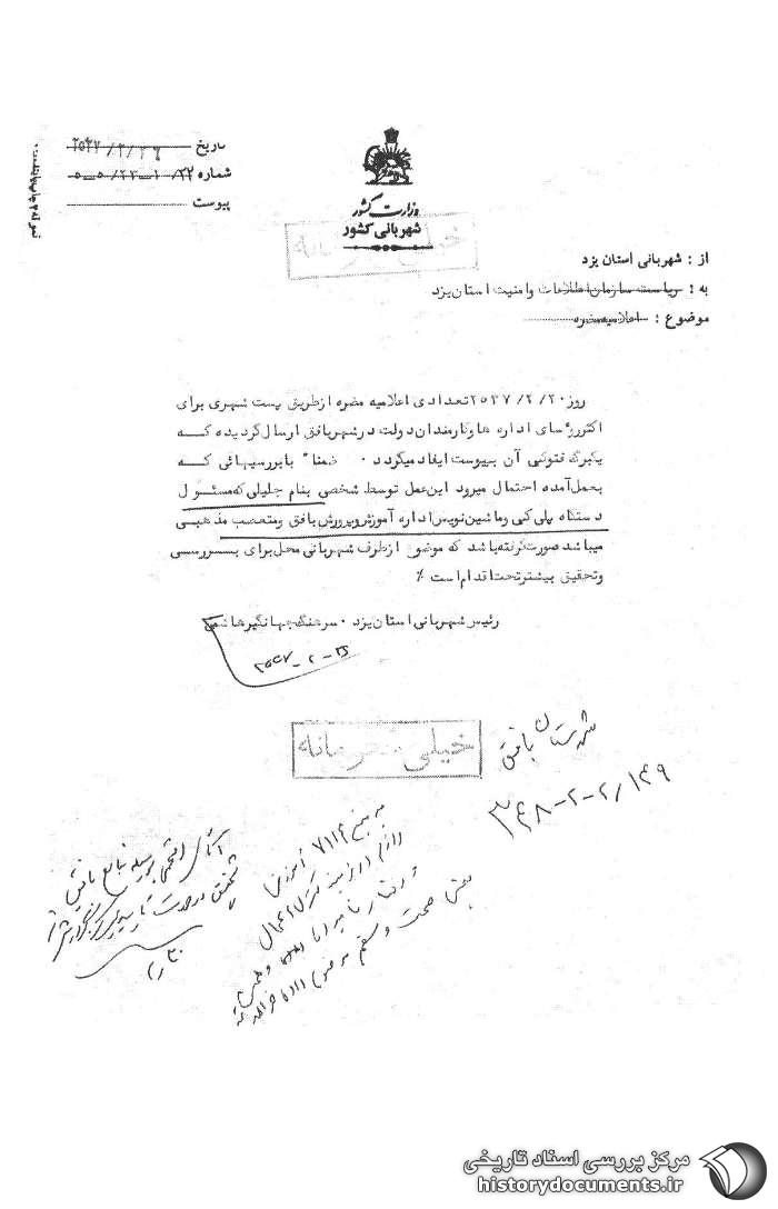 روز 20 /2 /2537 تعدادی اعلامیه مضره از طریق پست شهری برای اکثر رؤسای ادارهها و کارمندان دولت در شهر بافق ارسال گردیده که یک برگ فتوکپی آن به پیوست1 ایفاد میگردد. ضمناً با بررسیهائی که به عمل آمده احتمال میرود این عمل توسط شخصی به نام جلیلی که مسئول دستگاه پلیکپی و ماشیننویس اداره آموزش و پرورش بافق و متعصب مذهبی میباشد صورت گرفته باشد که موضوع از طرف شهربانی محل برای بررسی و تحقیق بیشتر تحت اقدام است.