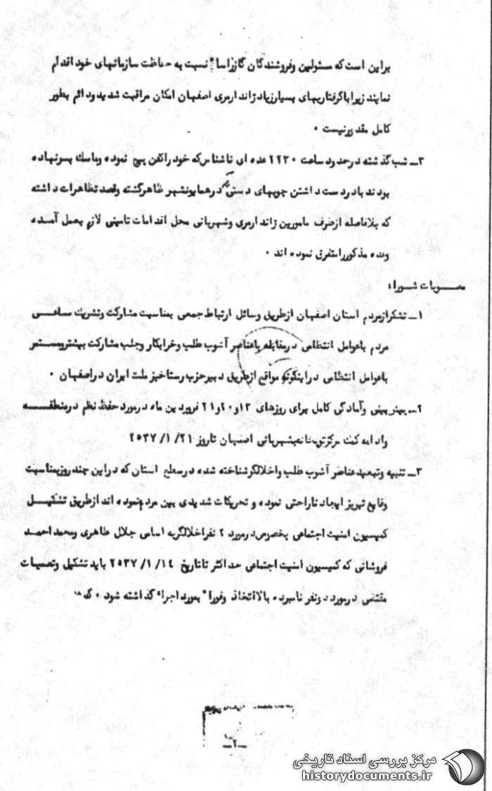 1- موجب نهایت خوشوقتی است که در جریانات اخیر استان اصفهان در آرامش به سر برد و به حمدالله مسئله حادی به وجود نیامد و این آرامش در نتیجه پیشبینی و تلاش شبانهروزی اعضای شورای هماهنگی و تأمین، مسئولین امور انتظامی و کمکهای به موقع مرکز توپخانه و موشکها از نظر تقویت عناصر شهربانی با اعزام نیروهای کمکی بوده و همچنین مشارکت مردم اصفهان با عناصر انتظامی در مقابله و مبارزه با عناصر آشوبطلب و عوامل اخلالگر در تامین نظم مؤثر بوده است.