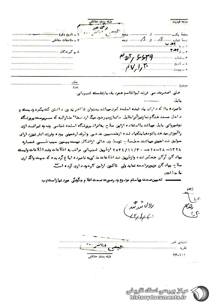 نامبرده بالا که دارای یک قبضه اسلحه کمری میباشد به عنوان تظاهر بدون داشتن کت به کمر خود بسته و داخل مسجد هنگام نماز نیز آن را مقابل جانماز و مهر خود میگذارد ضمناً مشارالیه که سرپرست پرورشگاه نوشیروانی بابل میباشد با استفاده از این سلاح به افراد پرورشگاه اسلحهشناسی و نحوه تیراندازی را آموزش میدهد باتوجه به اینکه یادشده از متعصّبین مذهبی و طرفدار خمینی بوده و فرزندانش نیز دارای سوابق ضدامنیتی میباشند حمل سلاح توسط وی خالی از اشکال نیست به همین سبب طیّ شماره 1328-28-525- 30 /11 /2534 از طریق شهربانی مراتب به اطلاعات و ضداطلاعات وابسته به پادگان گرگان منعکس شده و از طریق ضداطلاعات مذکور به نامبرده ابلاغ گردیده که جهت واگذاری سلاح به پادگان مزبور مراجعه نماید ولی تاکنون از این کار خودداری کرده است.