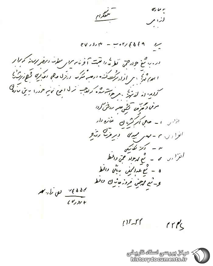 درباره شیخ جواد حجتی نظر عالی را به قسمت آخر نامه پیروی معطوف و به عرض میرساند که برابر اعلام شهربانی بابل افراد شرکتکننده در جلسه مشکوک در منزل حاجرضاکبیری به شرح زیر شناسائی گردیدهاند. از شهربانی بابل خواسته شده که به صاحب منزل ابلاغ نمایند خود را به این سازمان معرفی و چگونگی تشکیل جلسه روشن گردد.