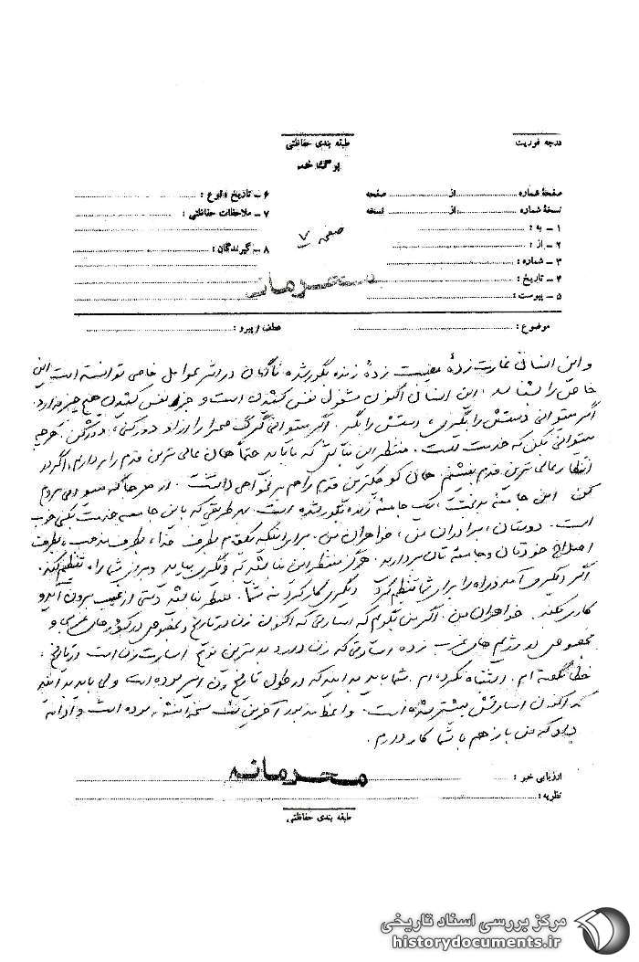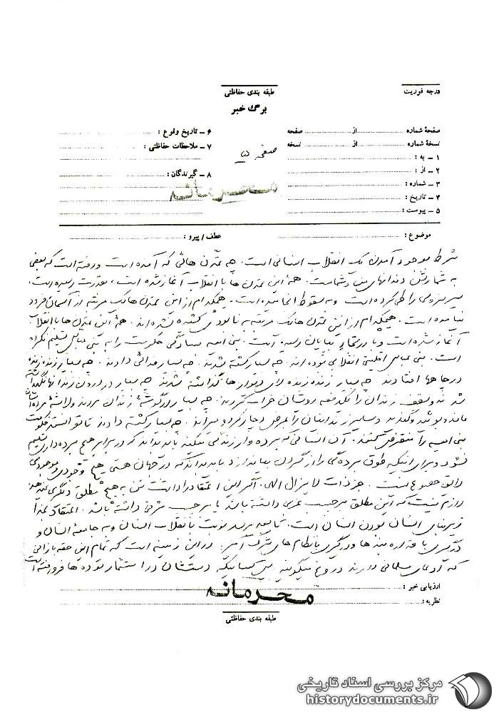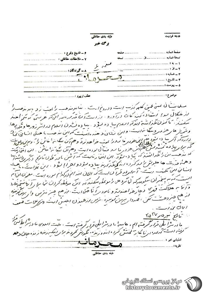 در تاریخ 31 /4 /37 ـ اگر من بگویم با اصول مذهبی دشمنی شده است سخنی به خطا نگفتهام. انسان این چنین خلق شده که آزادی را میخواهد و از زنجیر متنفر است قدرتهائی که میکوشند آگاهی انسانها را به حماقت تبدیل کنند. بشکند نیروهائی که از تقاضای آزادی انسانها زنجیری برای استثمار انسانها به وجود بیاورند خنثی کنند به این نیروهای منحرف کننده این قدرتهای به کجی کشانده این بتکدهها و میکدهها بتدارها و عوامل انحراف انسانها را خرد کنند از بین ببرد تا انسانها برای پیدا کردن راه انسانی خودشان به هیچ مانع خارجی برخورد نکنند راه را بتوانند خودشان براساس فطرت خودشان پیدا کنند. وقتی برخورد کردید با رهبران شرک معطل نکنید جای استدلال نیست جای شمشیر است و رگ گردنشان بکشید رهبران کفر را. ما حق و باطل را گفتیم انسانها خودشان انتخاب کنند. ما راه را بر این انسانها نشان دادیم خود این انسانها آزادند که مسیرشان را انتخاب کنند. با این زیربنای فلسفی آزادی و برابری هردو تضمین میشود. دوست من، برادر من، ای دوست عزیزی که مواریث کهن فرهنگیات غارت شده است و تمام معادن مادی موجود هم غارت میشود و حساب غارت تا ده قرن دیگر را هم کردهاند و تو اکنون میگردی که چگونه از دست این غارتکنندگان نجات پیدا کنی. به تو میگویم. جامعهای که برابری باشد و آزادی نباشد انسانیت محو شدهاست. در آن جامعهای که آزادی باشد و برابری نباشد انسانیت محو شدهاست غرب آزادی را آورده است سر برابری را بریده است شرق برابری را ادعا کرده است که آورده است. گردن آزادی را بریده است. این انسان هم میخواهد آزاد باشد و هم برابر. برابری همراه آزادی احتیاج به یک چنین زیر بنای فلسفی و مکتبی دارد.