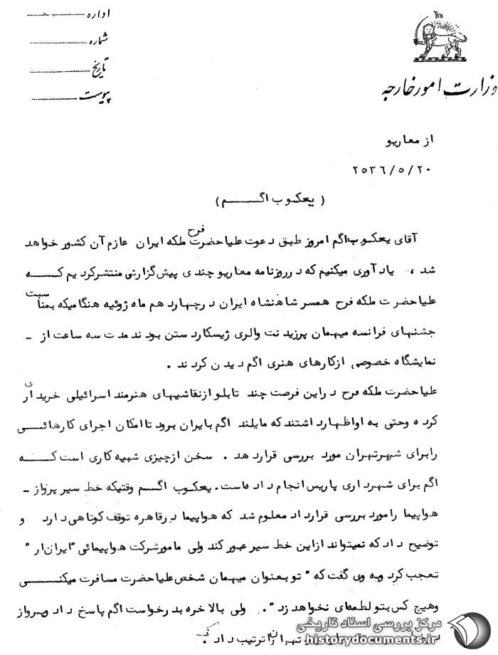 آقای یعکوب اگم، امروز طبق دعوت علیاحضرت فرح ملکه ایران، عازم آن کشور خواهد شد، یادآوری میکنیم که در روزنامه معاریو، چندی پیش گزارشی منتشر کردیم که علیاحضرت ملکه فرح، همسر شاهنشاه ایران، در چهاردهم ماه ژوئیه، هنگامیکه به مناسبت جشنهای فرانسه، میهمان پرزیدنت والری ژیسکاردستن بودند، مدت سه ساعت از نمایشگاه خصوصی، از کارهای هنری اگم دیدن کردند.