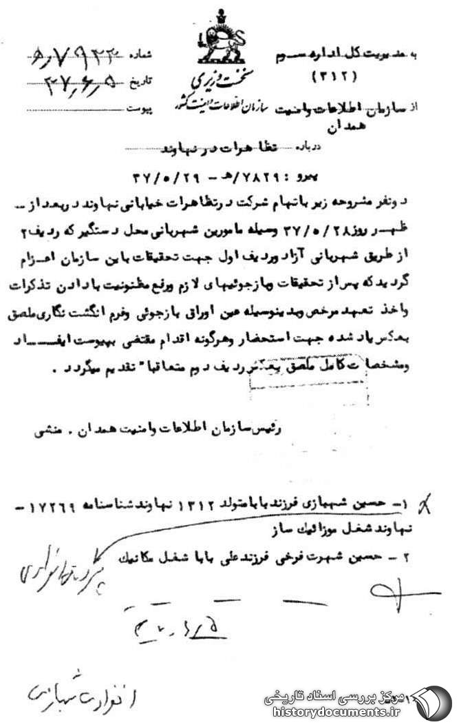 دو نفر مشروحه زیر به اتهام شرکت در تظاهرات خیابان نهاوند در بعد از ظهر روز 28 /5 /37 به وسیله مأمورین شهربانی محل دستگیر که ردیف ۲ از طریق شهربانی آزاد و ردیف اول جهت تحقیقات به این سازمان اعزام گردید که پس از تحقیقات و بازجوییهای لازم و رفع مظنونیت با دادن تذکرات و اخذ تعهد مرخص و بدین وسیله عین اوراق بازجویی و فرم انگشت نگاری ملصق به عکس یاد شده جهت استحضار و هر گونه اقدام مقتضی به پیوست ایفاد و مشخصات کامل ملصق به عکس ردیف دوم متعاقباً تقدیم میگردد.