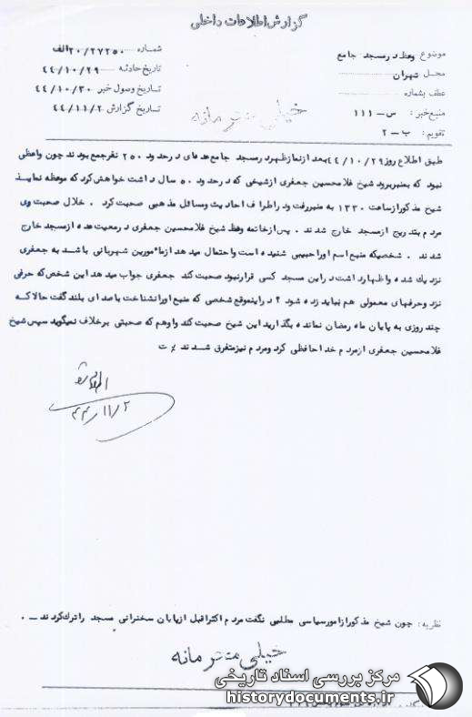 طبق اطلاع روز 29 /10 /44 بعد از نماز ظهر در مسجد جامع عدهای در حدود 250 نفر جمع بودند چون واعظی نبود که به منبر برود شیخ غلامحسین جعفری از شیخی که در حدود 50 سال داشت خواهش کرد که موعظه نماید شیخ مذکور از ساعت 1330 به منبر رفت و در اطراف احادیث و مسایل مذهبی صحبت کرد.