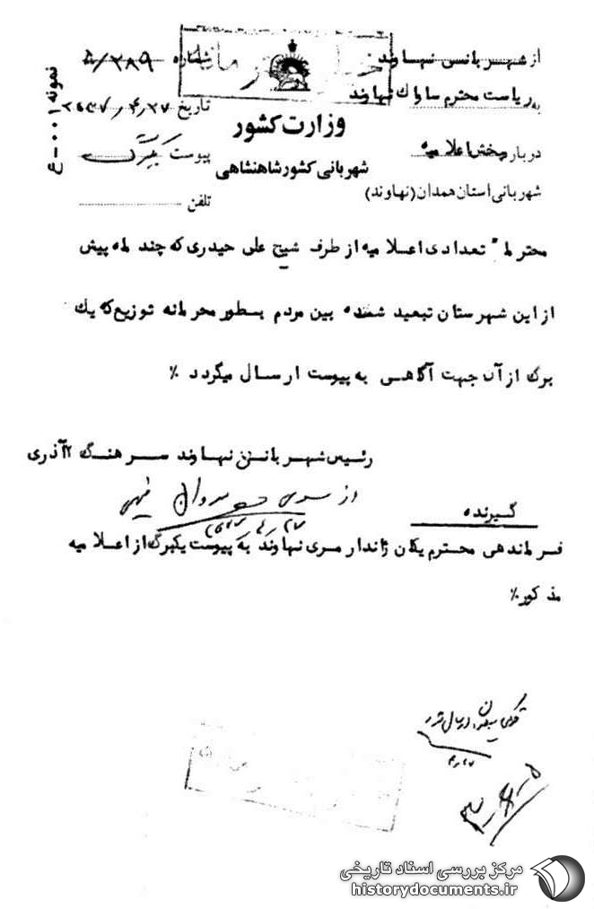 محترماً تعداد اعلامیه از طرف شیخ على حیدری که چند ماه پیش از این شهرستان تبعید شده بین مردم به طور محرمانه توزیع که یک برگ آن جهت آگاهی به پیوست ارسال میگردد.