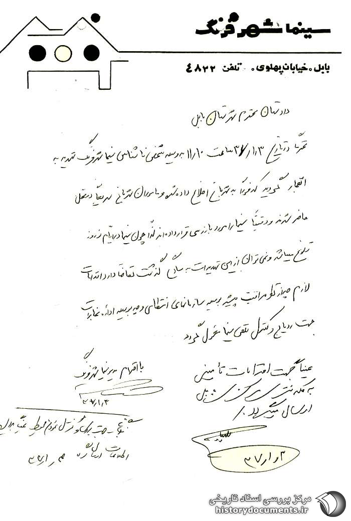 محترماً در تاریخ 3 /1 /37 ساعت 1110 به وسیله شخص ناشناس سینما شهرفرنگ تهدید به انفجار گردید که فوراً به شهربانی اطلاع داده شد و مأموران شهربانی سریعاً در محل حاضر شدند و دقیقاً سینما را مورد بازرسی قرار دادهاند لذا چون سینما در ایام نوروز شلوغ میباشد و نمیتوان از این تهدیدات به سادگی گذشت تقاضا دارد اقدامات لازم چه از نظر مراقبت بیشتر به وسیله سازمانهای انتظامی و چه به وسیله اداره مخابرات جهت ردیابی و کنترل تلفن سینما معمول گردد.