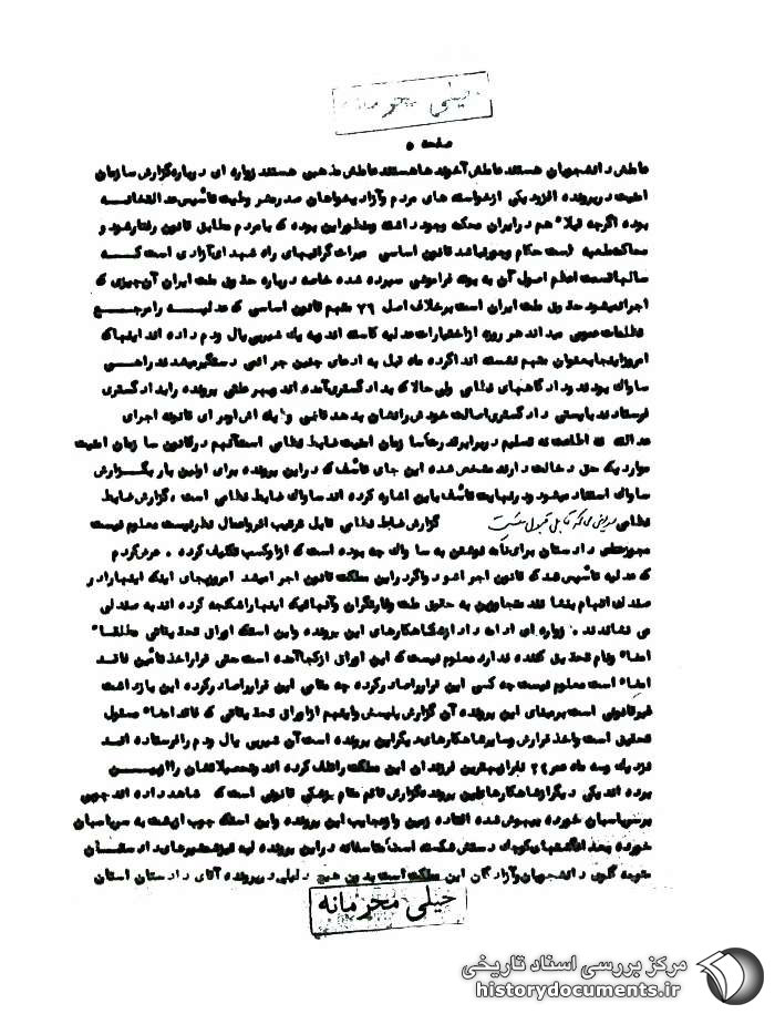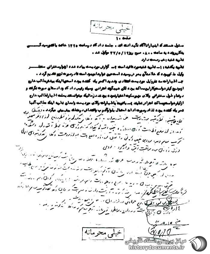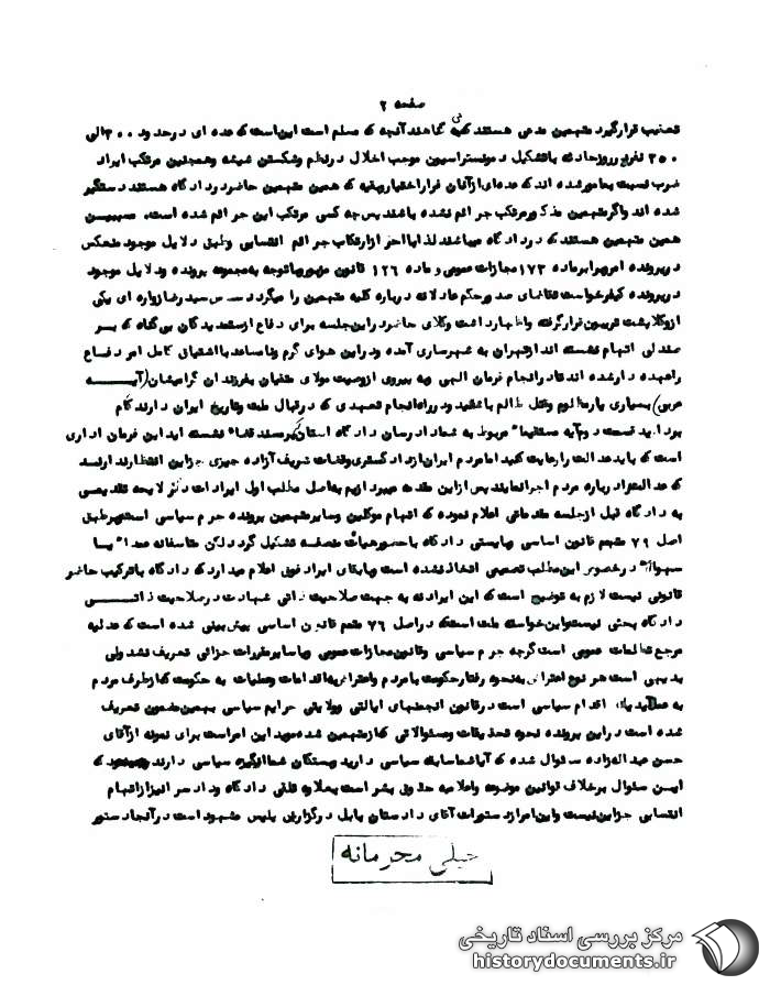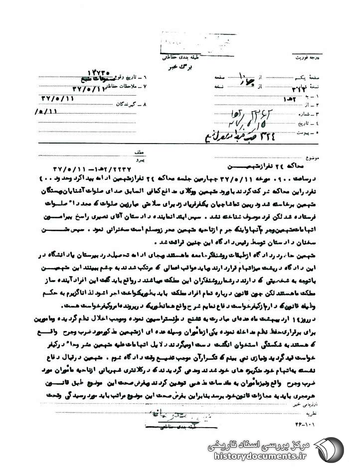 3ـ اظهارات سه نفر وکیل مورد بحث انتقادی و شدیداً تحریککننده بوده است و با اینکه بیشتر مطالب خارج از موضوع کیفرخواست و کار این محاکمه بوده لکن هیچگونه اعتراضی وسیله رئیس دادگاه و دادستان صورت نگرفته و در تمام طول سخنرانی وکلای مزبور سکوت اختیار نموده بودند درحالی که میتوانستند بهعلّت اظهار مطالب خارج از کیفرخواست و محاکمه اعتراض نمایند. 4ـ باتوجه به اظهارات وکلای مورد بحث و امعان نظر به اینکه مطالب آنها تحریککننده بوده لذا در صورت ادامه احتمال بلوا و آشوب و اغتشاش در منطقه پیشبینی میگردد. دوستان