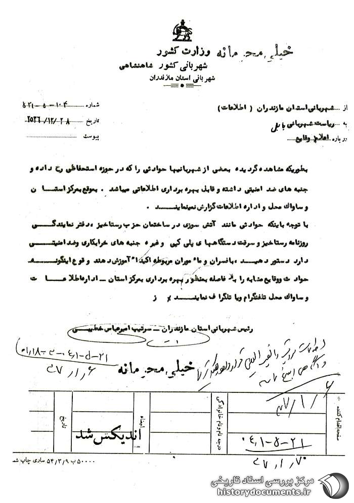 به طوریکه مشاهده گردیده بعضی از شهربانیها حوادثی را که در حوزه استحفاظی رخ داده و جنبههای ضدامنیتی داشته و قابل بهرهبرداری اطلاعاتی میباشد به موقع به مرکز استان و ساواک محل و اداره اطلاعات گزارش نمینمایند.