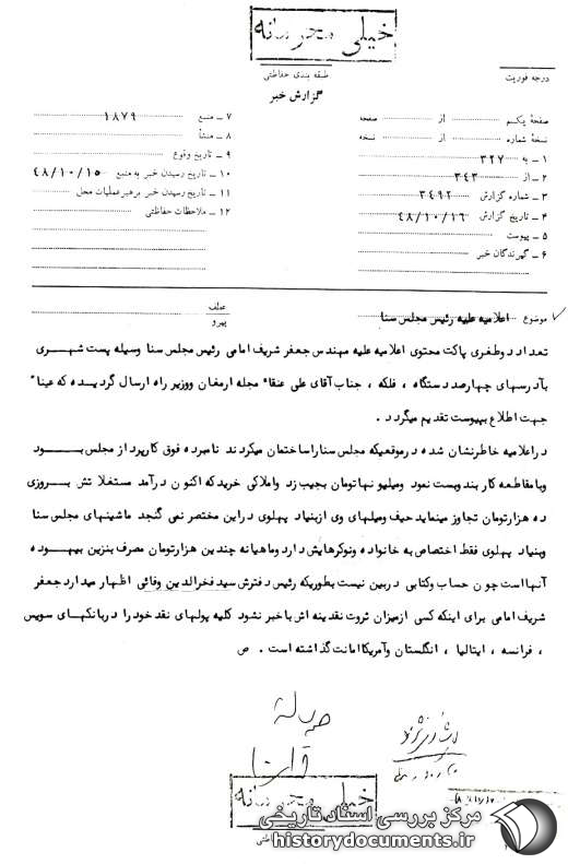 تعداد دو طغری پاکت محتوی اعلامیه علیه مهندس شریفامامی، رئیس مجلس سنا، وسیله پست شهری به آدرسهای چهارصد دستگاه، فلکه، جناب آقای علی عنقاء، مجله ارمغان و وزیر راه ارسال گردیده که عیناً جهت اطلاع به پیوست تقدیم میگردد.