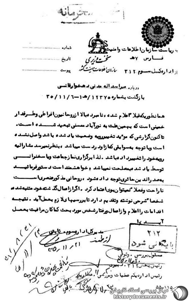 همان طوری که قبلاً اعلام شده، نامبرده بالا از روحانیون افراطی و طرفدار خمینی است که به همین علت به نورآباد ممسنی تبعید شده است. تاکنون گزارشی که مؤید تغییر رویه وضعیت یاد شده باشد واصل نشده است و با توجه به سوابقی که از او در دست میباشد، به نظر نمیرسد مشارالیه رویه خود را تغییر داشته باشد. لذا برگزاری نماز جماعت یا سخنرانی توسط یاد شده به مصلحت نمیباشد، خواهشمند است دستور فرماید به صدرالدین حائری1 توجه داده شود، روحانی مذکور عنصری است ناراحت و فعلاً نمیتوان به وی اعتماد کرد. اگر از اعمال گذشته خود منتنبه شده، شخصاً شرحی نوشته و تقدیم دارد تا بررسیهای لازم به عمل آید. نتیجه اقدامات را اعلام و از اعمال و رفتار شخص مورد بحث کماکان مراقبت به عمل آید.