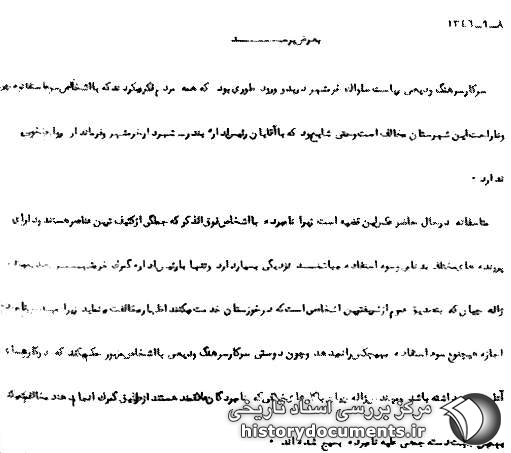 متأسفانه در حال حاضر عکس این قضیه است زیرا نامبرده با اشخاص فوق الذکر که جملگی از کثیفترین عناصر هستند و دارای پروندههای مختلف بدنامی و سوءاستفاده میباشند نزدیکی بسیار دارد و تنها با رئیس اداره گمرک خرمشهر یعنی مهندس ژاله چیان که به تصدیق عموم از شریفترین اشخاصی است که در خوزستان خدمت میکنند اظهار مخالفت مینماید زیرا مهندس نامبرده اجازه هیچ نوع سوء استفاده به هیچ کس را نمیدهد و چون دوستی سرکار سرهنگ ودیعی با اشخاص مزبور حکم میکند که در کارهای آنان سهمی داشته باشد و مهندس ژاله چیان با کارهای خلافی که نامبردگان علاقمند هستند از طریق گمرک انجام دهند مخالفت میکند به همین جهت دسته جمعی علیه نامبرده بسیج شدهاند.