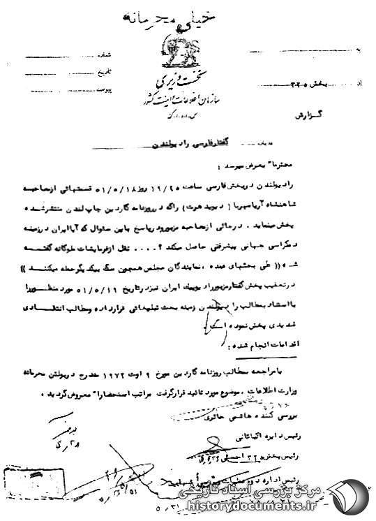 با مراجعه به مطالب روزنامه گاردین مورخ 9 اوت 1972 مندرج در بولتن محرمانه وزارت اطلاعات، موضوع مورد تأیید قرار گرفت مراتب استحضارا معروض گردید.