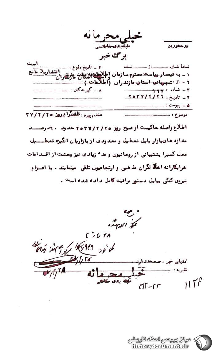 اطلاع واصله حاکیست از صبح روز 25 /2 /2537 حدود 60 درصد مغازههای بازار بابل تعطیل1 و معدودی از بازاریان انگیزه تعطیل محل کسب را پشتیبانی از روحانیون و عده زیادی نیز وحشت از اقدامات خرابکارانه اخلالگران مذهبی و ارتجاعیون تلقی مینمایند. با اعزام نیروی کمکی به بابل دستور مراقبت کامل داده شده است.