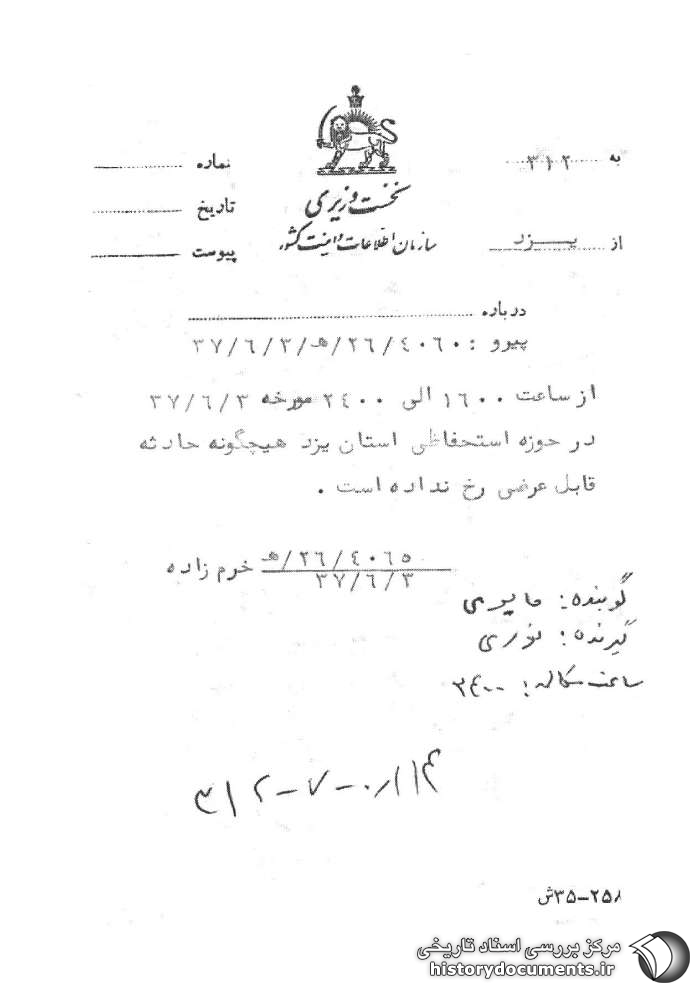 از ساعت 1600 الی 2400 مورخه 3 /6 /37 در حوزه استحفاظی استان یزد هیچگونه حادثه قابل عرضی رخ نداده است.
