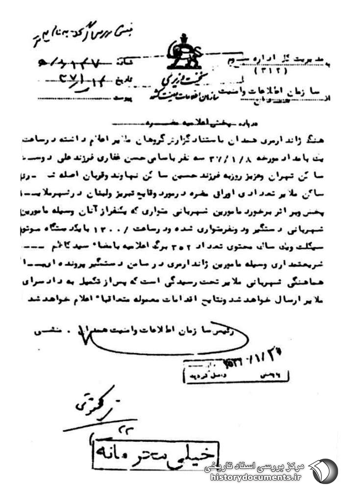 هنگ ژاندارمری همدان به استناد گزارش گروهان ملایر اعلام داشته در ساعت یک بامداد مورخه 18 /1 /37 سه نفر به اسامی حسن غفاری فرزند علی دوست ساکن تهران و عزیز روزبه فرزند حسین ساکن نهاوند و قربان اصله شهری ساکن ملایر تعدادی اوراق مضره در مورد وقایع تبریز و لبنان در شهر ملایر پخش و بر اثر برخورد مأمورین شهربانی متواری که یک نفر از آنان وسیله مأمورین شهربانی دستگیر و دو نفر متواری شده و در ساعت ۱۳۰۰ با یک دستگاه موتورسیکلت و یک ساک محتوى تعداد ۳۵۲ برگ اعلامیه بامضاء سیدکاظم شریعتمداری وسیله مأمورین ژاندارمری در سامن دستگیر پروندهای با هماهنگی شهربانی ملایر تحت رسیدگی است که پس از تکمیل به دادسرای ملایر ارسال خواهد شد و نتایج اقدامات معموله متعاقباً اعلام خواهد شد.