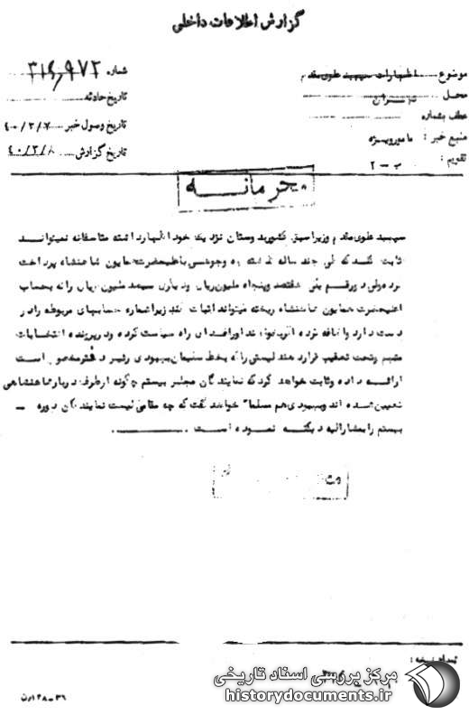 سپهبد علوى مقدم، وزیر اسبق کشور، به دوستان نزدیک خود اظهار داشته: متأسفانه نمىتواند ثابت کند که طى چند ساله گذشته، وجوهى به اعلیحضرت همایون شاهنشاه پرداخت کرده، ولى دو رقم، یکى هفتصد و پنجاه میلیون ریال و دیگرى سیصد میلیون ریال را که به حساب اعلیحضرت همایون شاهنشاه ریخته، مىتواند اثبات کند؛ زیرا شماره حسابهای مربوطه را در دست دارد و اضافه کرده: اگر بخواهند او را فداى راه سیاست کرده و در پرونده انتخابات، متهم و تحت تعقیب قرار دهند، لیستى را که به خط سلیمان بهبودى، رئیس دفتر مخصوص است، ارائه داده و ثابت خواهد کرد که نمایندگان مجلس بیستم، چگونه از طرف دربار شاهنشاهى تعیین شدهاند و بهبودى هم مسلماً خواهد گفت که چه مقامى لیست نمایندگان دوره بیستم را به مشارالیه دیکته نموده است.
