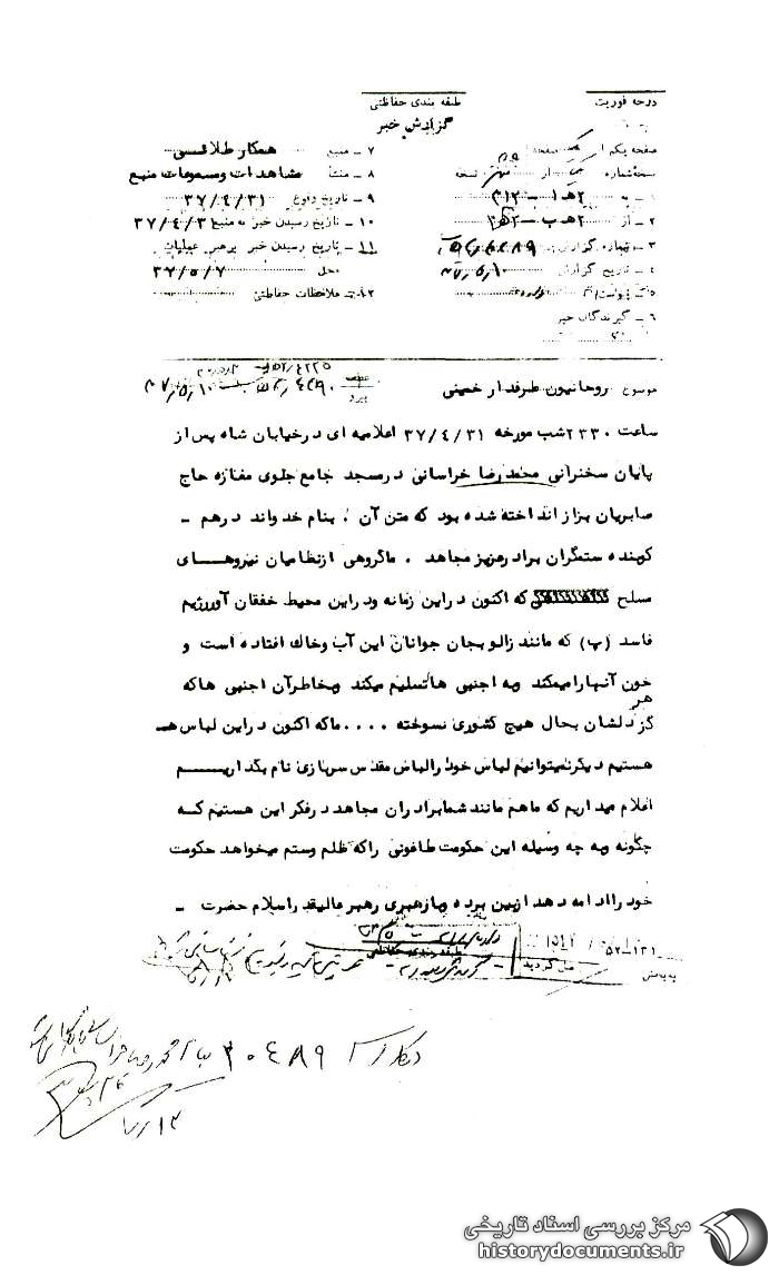 نظریه یکشنبه: نظریه شنبه مورد تائید است. اعلامیه موصوف مورخه 5 /5 / 37 واصل گردید به منبع توجه داده شد، منبعد در ارسال اعلامیه سرعت عمل بیشتری به کار برد. محمدرضا خراسانی از افراطیون مذهبی و از طرفداران خمینی میباشد که صحبتهای وی نیز حاکی از این مسائل بوده [است]. زیرک
