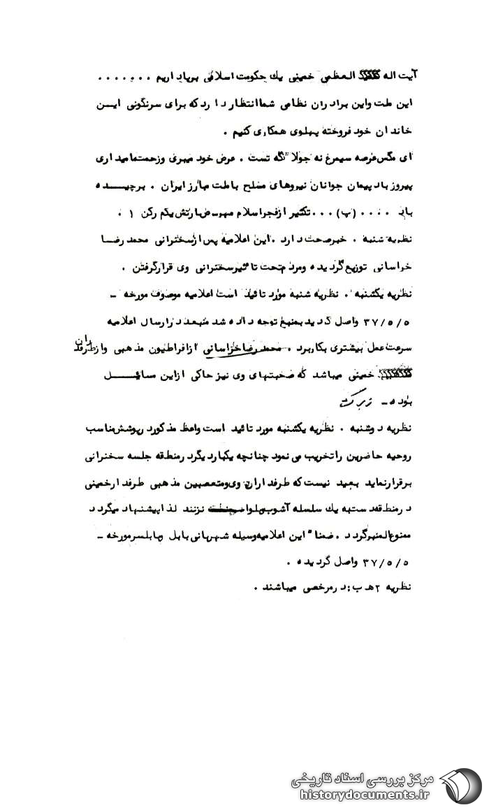 نظریه دوشنبه: نظریه یکشنبه مورد تائید است. واعظ مذکور در پوشش مناسب روحیه حاضرین را تخریب مینمود، چنانچه یک بار دیگر در منطقه جلسه سخنرانی برقرار نماید، بعید نیست که طرفداران وی و متعصّبین مذهبی، طرفدار خمینی در منطقه دست به یک سلسله آشوب و بلوا نزنند. لذا پیشنهاد میگردد ممنوعالمنبر گردد. ضمناً این اعلامیه وسیله شهربانی بابل و بابلسر مورخه 5 /5 /37 واصل گردیده [است].