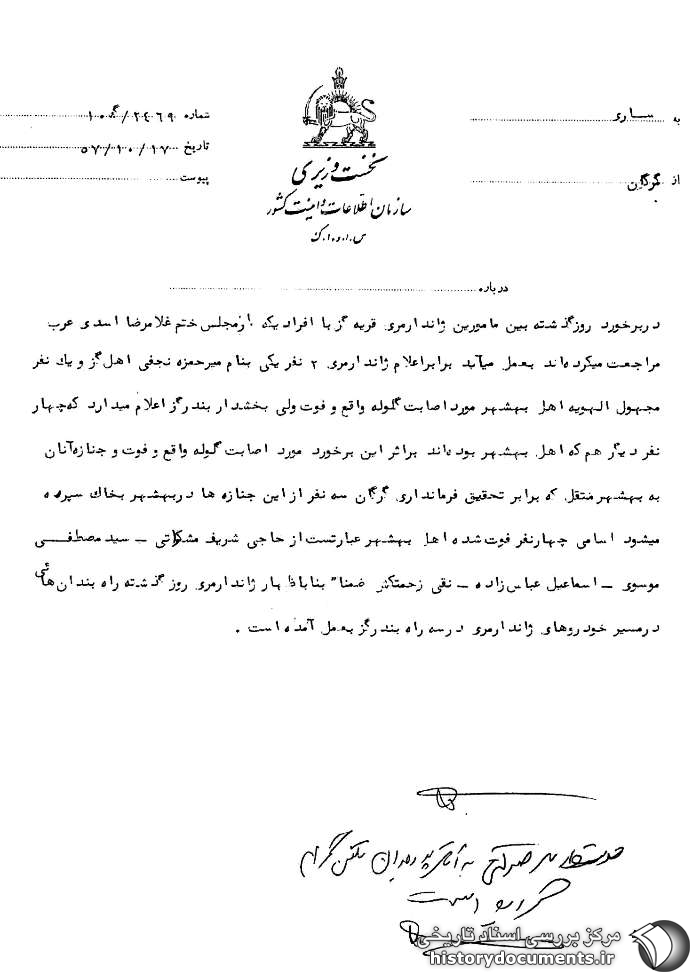 در برخورد روز گذشته بین مأمورین ژاندارمری قریه گز با افرادی که از مجلس ختم غلامرضا اسدی عرب مراجعت میکردهاند به عمل میآید برابر اعلام ژاندارمری 2 نفر یکی به نام میرحمزه نجفی اهل گز و یک نفر مجهول الهویه اهل بهشهر مورد اصابت گلوله و فوت ولی بخشدار بندرگز اعلام میدارد که چهار نفر دیگر هم که اهل بهشهر بودهاند بر اثر این برخورد مورد اصابت گلوله واقع و فوت و جنازه آنان به بهشهر منتقل که برابر تحقیق فرمانداری گرگان سه نفر از این جنازهها در بهشهر به خاک سپرده میشود اسامی چهار نفر فوت شده اهل بهشهر عبارتست از حاجی شریف مشکواتی ـ سید مصطفی موسوی ـ اسماعیل عباسزاده ـ نقی زحمتکش ضمناً بنا به اظهار ژاندارمری روز گذشته راه بندانهایی در مسیر خودروهای ژاندارمری در سه راه بندرگز به عمل آمده است.