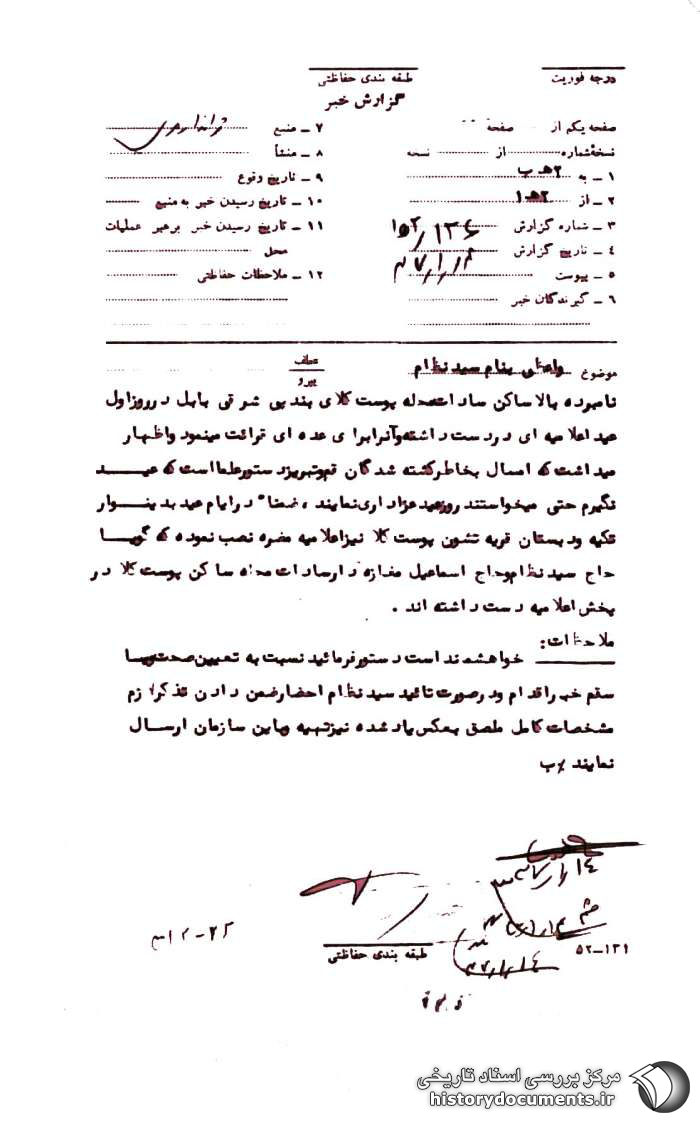 خواهشمند است دستور فرمایید نسبت به تعیین صحت و یا سقم خبر اقدام و در صورت تایید سیدنظام احضار ضمن دادن تذکر لازم مشخصات کامل ملصق به عکس یادشده نیز تهیه و به این سازمان ارسال نمایند.
