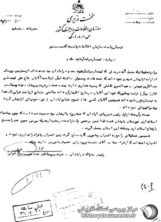 جسته و گریخته از قول رئیس شهربانى آبادان که همه روزه با ایشان بوده صحبت شده است که چون پیشنهاد استانداری خوزستان به ایشان شده لذا ضمن مرخصى و استراحت در نظر دارد یک بررسى عمومى هم راجع به اوضاع استاندارى و منطقه این استان به عمل آورند.