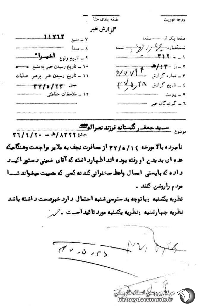 نامبرده بالا مورخه 14 /5 /37 از مسافرت نجف به ملایر مراجعت و هنگامی که عدهای به دیدن او رفته بودهاند اظهار داشته که آقای خمینی دستور اکید داده که بایستی امسال واعظ سخنرانی کند نه کسی که مصیبت میخواند تا مردم را روشن کند. نظریه یکشنبه: با توجه به دسترسی شنبه احتمال دارد خبر صحت داشته باشد.