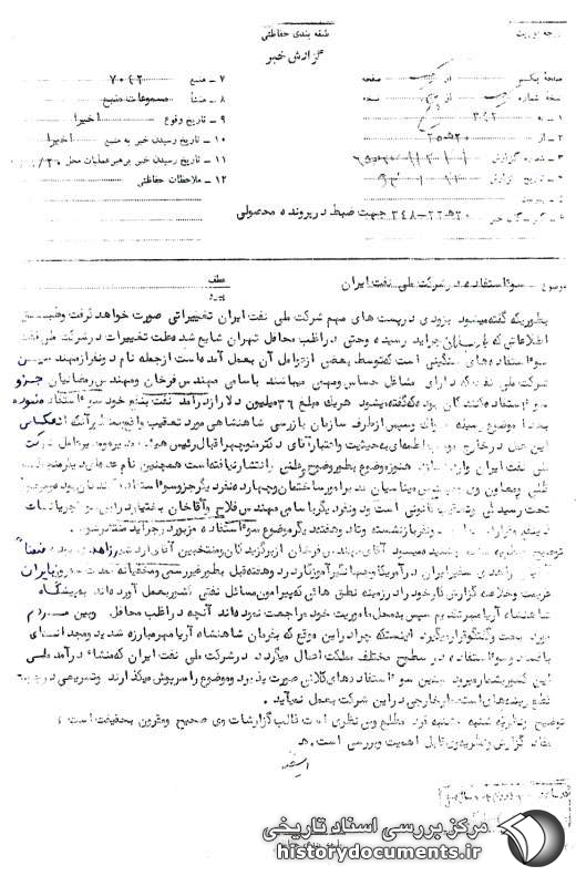 بهطوری که گفته میشود: به زودی در پستهای مهم شرکت ملی نفت ایران تغییراتی صورت خواهد گرفت و طبق اطلاعاتی که به اربابان جراید رسیده و حتی در اغلب محافل تهران شایع شده، علت تغییرات در شرکت ملی نفت، سوءاستفادههای سنگینی است که توسط بعضی از عوامل آن بهعمل آمده است؛ از جمله نام دو نفر از مهندسین شرکت ملی نفت، که دارای مشاغل حساس و مهمی میباشند، به اسامی مهندس فرخان و مهندس رمضانیان، جزو سوءاستفادهکنندگان بوده که گفته میشود: هریک مبلغ 36 میلیون دلار از درآمد نفت به نفع خود سوءاستفاده نموده، بعداً موضوع وسیله ساواک و سپس از طرف سازمان بازرسی شاهنشاهی مورد تعقیب واقع و به منظور آنکه انعکاس این عمل در خارج موجب لطمهای به حیثیت و اعتبار آقای دکتر منوچهر اقبال، رئیس هیئت مدیره و مدیرعامل شرکت ملی نفت ایران، وارد نسازد، هنوز موضوع به طور وضوح و علنی انتشار نیافته است. همچنین نام عدهای دیگر منجمله: ظلی و معاون وی و مهندس میناسیان، مدیر امور ساختمان و چهارده نفر دیگر جزو سوءاستفادهکنندگان بوده و موضوع تحت رسیدگی و تعقیب قانونی است و دو نفر دیگر به اسامی مهندس فلاح و آقاخان بختیار، در این سوء جریانات ذینفع و قرار است این دو نفر بازنشسته و تا دو هفتۀ دیگر، موضوع سوءاستفاده مزبور در جراید منتشر شود.