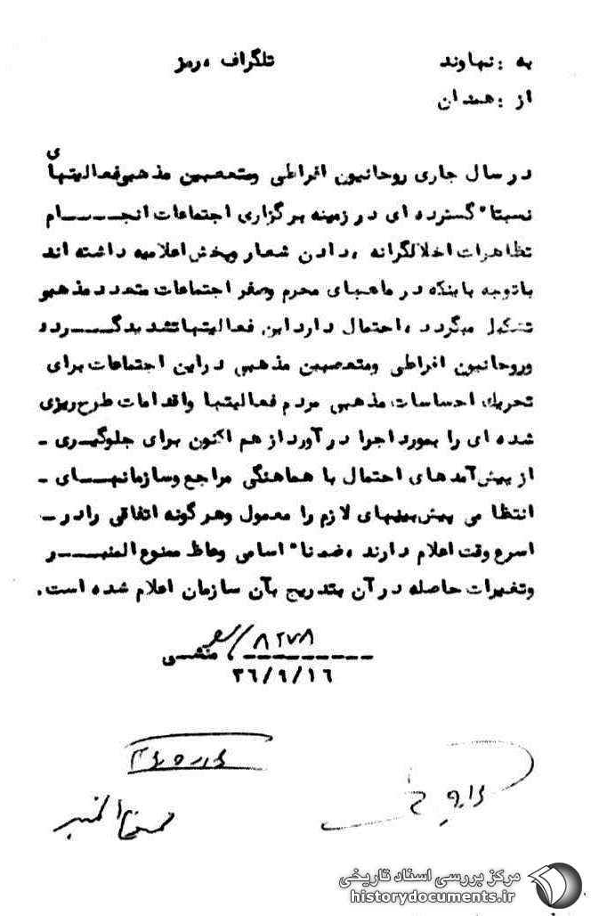 در سال جاری روحانیون افراطی و متعصبین مذهبی فعالیتهای نسبتاً گستردهای در زمینه برگزاری اجتماعات انجام تظاهرات اخلالگرانه، دادن شعار و پخش اعلامیه داشتهاند با توجه به اینکه در ماههای محرم و صفر اجتماعات متعدد مذهبی تشکیل میگردد، احتمال دارد این فعالیتها تشدید گردد و روحانیون افراطی و متعصبین مذهبی در این اجتماعات برای تحریک احساسات مذهبی مردم فعالیتها و اقدامات طرحریزی شدهای را به مورد اجرا درآورد از هم اکنون برای جلوگیری از پیش آمدهای احتمال با هماهنگی مراجع و سازمان های انتظامی پیشبینیهای لازم را معمول و هر گونه اتفاق را در اسرع وقت اعلام دارند، ضمناً اسامی وعاظ ممنوعالمنبر و تغییرات حاصله در آن به تدریج به آن سازمان اعلام شده است.