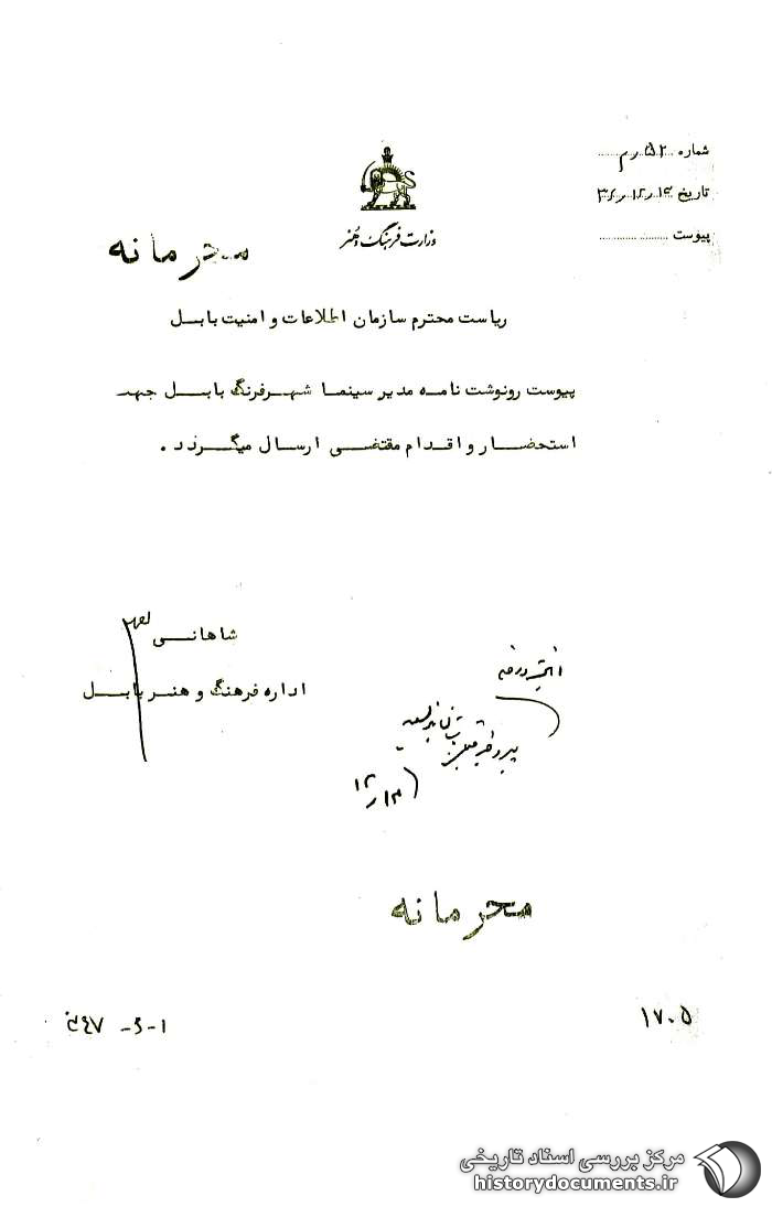 [به]پیوست1 رونوشت نامه مدیر سینما شهر فرنگ بابل جهت استحضار و اقدام مقتضی ارسال میگردد. شاهانی