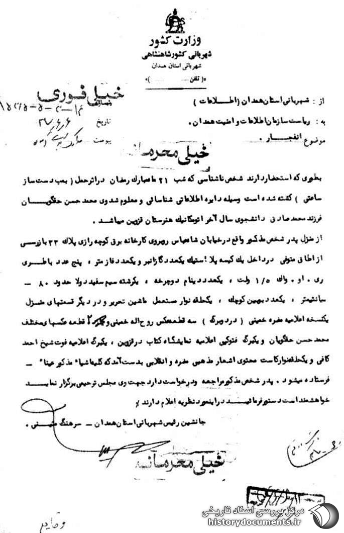 به طوری که استحضار دارند شخصی ناشناس که شب ۲۱ ماه مبارک رمضان در اثر حمل (بمب دستساز ساعتی) کشته شده است وسیله دایره اطلاعاتی شناسایی و معلوم شد وی محمدحسن حقگویان1 فرزند محمد صادق دانشجوی سال آخر اتومکانیک هنرستان قزوین میباشد.