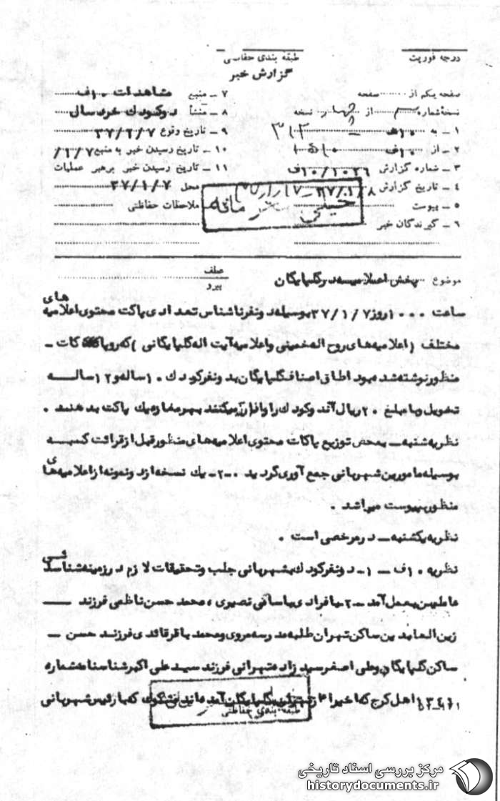 ۲- به افرادی به اسامی نصیری، محمدحسن ناظمی فرزند زینالعابدین ساکن تهران طلبه مدرسه مروی و محمدباقر قائدی فرزند حسن ساکن گلپایگان و علیاصغر سیدزاده تهرانی فرزند علیاکبر شناسنامه شماره ۱۳۴۱ اهل کرج که اخیراً از تهران به گلپایگان آمدهاند مشکوک که با رئیس شهربانی مذاکره شده است.