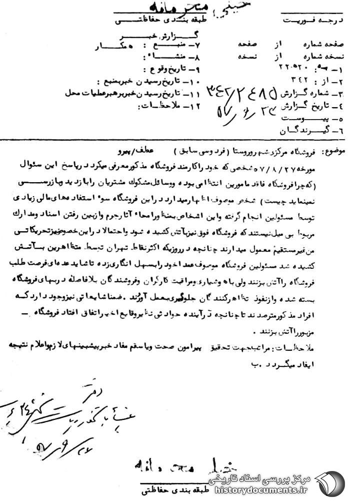 مورخه 27 /8 /57 شخصی که خود را کارمند فروشگاه مذکور معرفی میکرد، در پاسخ این سئوال (که چرا فروشگاه فاقد مامورین انتظامی بوده و وسائل مشکوک مشتریان را بازدید و بازرسی نمینمایند، چیست) شخص موصوف اظهار میدارد: در این فروشگاه سوءاستفادههای مالی زیادی توسط مسئولین انجام گرفته و این اشخاص به منظور امحاء آثار جرم و از بین رفتن اسناد و مدارک مربوط بیمیل نیستند که فروشگاه فوق نیز به آتش کشیده شود و احتمالاً در این خصوص نیز تحریکاتی من غیر مستقیم معمول میدارند؛ چنانچه در روزی که اکثر نقاط تهران توسط متظاهرین به آتش کشیده شد، مسئولین فروشگاه موصوف عمداً خود را به سهلانگاری زده تا شاید عدهای فرصتطلب، فروشگاه را آتش بزنند؛ ولی با هوشیاری و مراقبت کارگران و فروشندگان، بلافاصله دربهای فروشگاه بسته شده و از نفوذ تظاهرکنندگان جلوگیری به عمل آوردند. ضمناً شایعاتی نیز وجود دارد که افراد مذکور مترصدند تا چنانچه در آینده حوادثی نظیر وقایع اخیر اتفاق افتاد فروشگاه مزبور را آتش بزنند.