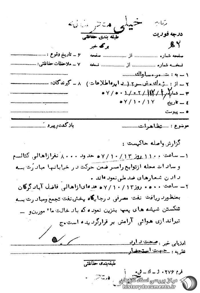 1ـ ساعت 1100 روز 13 /10 /57 حدود 8000 نفر از اهالی کتالم و سادات محله از توابع رامسر ضمن حرکت در خیابانها مبادرت به دادن شعارهای ضد ملی نمودهاند.