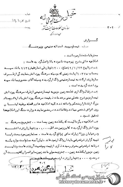 1ـ در تاریخ 23 /1 /49 مبلغ 12000 تومان طی شماره فیش 9134 بانک سپه، به حساب 10375 از بابت زمینی که به وسیله سرهنگ پوردانش به نمایندگی از طرف سازمان تدارکات به تیمسار صنیعی واگذار گردیده، وسیله آقای منصوری به بانک سپه پرداخت گردیده است.
