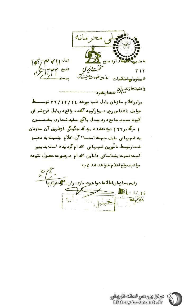 برابر اعلام سازمان بابل شب مورخه 14 /12 /36 توسط عوامل ناشناس روی دیوار کوچه آکنده واقع در بابل فرح شرقی کوچه مسجد جامع در دو محل با گچ سفید شعاری به مضمون (مرگ بر 66) نوشته شده بود که چگونگی از طریق آن سازمان به شهربانی بابل جهت امحای آن اعلام و نسبت به محو شعار توسط مأمورین شهربانی اقدام گردیده است بدیهی است نسبت به شناسایی عاملین اقدام در صورت حصول نتیجه مراتب به موقع اعلام خواهد شد. ب