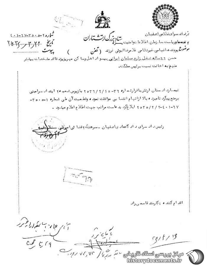 تیمسار دادستان ارتش با قرار شماره 36-15 /2 /2536 بازپرس شعبه 2 این دادسرا مبنی بر منع پیگرد نامبرده بالا از اتهام انتسابی موافقت نموده و قطعیت آن طی شماره 1- 3505- 67- 401 – 2 /3 /2535 ابلاغ گردیده است مراتب جهت اطلاع اعلام میشود.