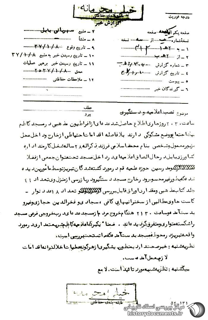 ساعت 2030 روز جاری اطّلاع حاصل شد عدّهای از افراطیون مذهبی در مسجد کاظمبیک اجتماع و وضع مشکوکی دارند بلافاصله اقدامات احتیاطی از خارج و داخل محل مزبور معمول و شخصی به نام محمد اسلامی فرزند ذکرالله 28 ساله شغل کارمند اداره کشاورزی بابل در حال الصاق اعلامیهای در داخل مسجد تحت عنوان جمعی از فضلا و مدرّسین حوزه علمیه قم درمورد کشتهشدگان تبریز توسط مأمورین دیده شده که به طور غیرمحسوس و در خارج مسجد دستگیر و در بازپرسی از منزل وی تعداد 46 جلد کتاب مذهبی و مقداری اوراق قابل بررسی و تعداد 18 عدد نوار کاست حاوی مطالبی از سخنرانیهای کافی، سجّادی و فخرالدین حجازی و غیره به دست آمده و ساعت 2130 هنگام خروج مردم از مسجد عدّهای درب خروجی فرعی مسجد را شکسته متواری و متفرق گردیدهاند. ضمناً یک برگ اعلامیه کاظم شریعتمداری در مورد واقعه تبریز در محوطهی مسجد به دست آمده که مراتب تحت بررسی است.